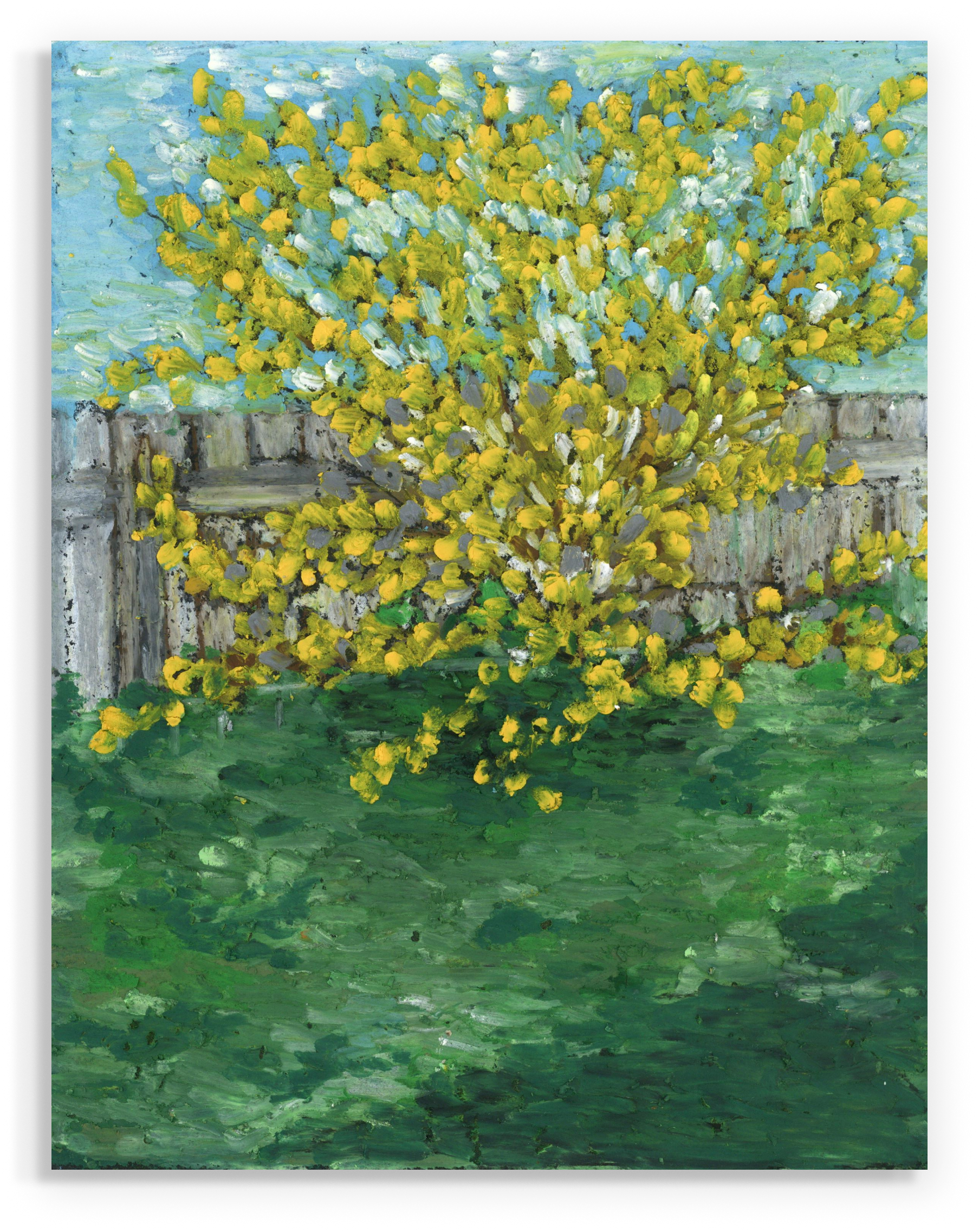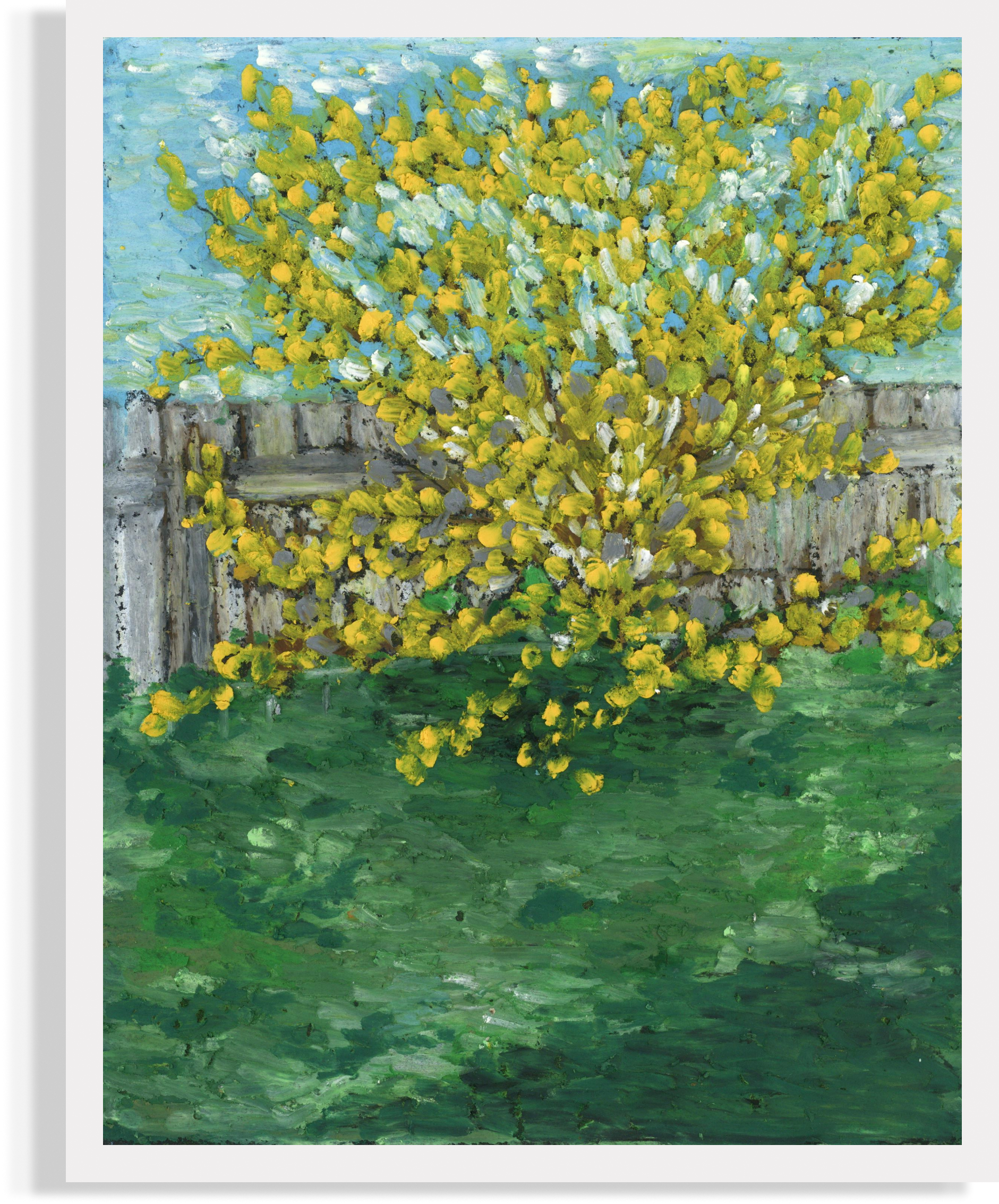 Northern Gold Forsythia is a single tall plant growing in my backyard. Amazing yellow blossom in spring and summer – a glorious view from my kitchen window. I used oil pastels to imitate the Impasto style while drawing to make it more expressive and fluffy!