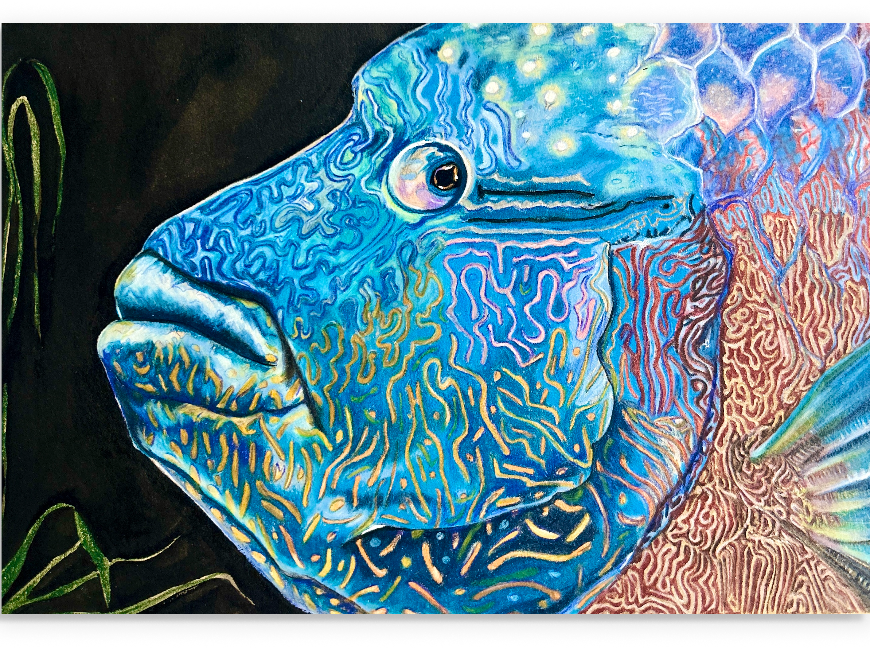 A king of coral reefs! As beautiful as important for coral reef health, long-lived but declining species. I found this fish in the book “A Wild Child’s Guide to Endangered Animals” and thought of its unique electric blue coloration. I almost got lost drawing its numerous sinuous lines and ever-changing shades!