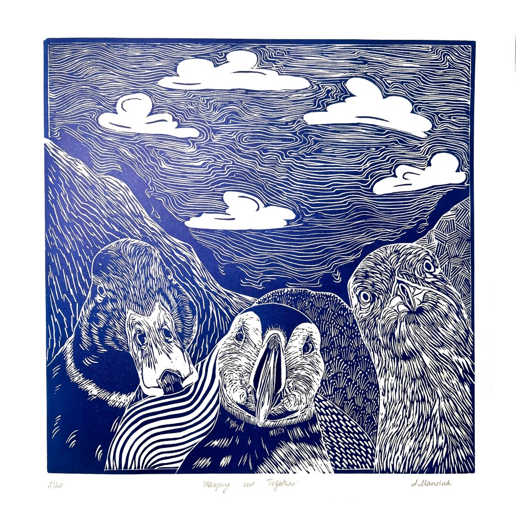 Hanging Out Together, lino print
