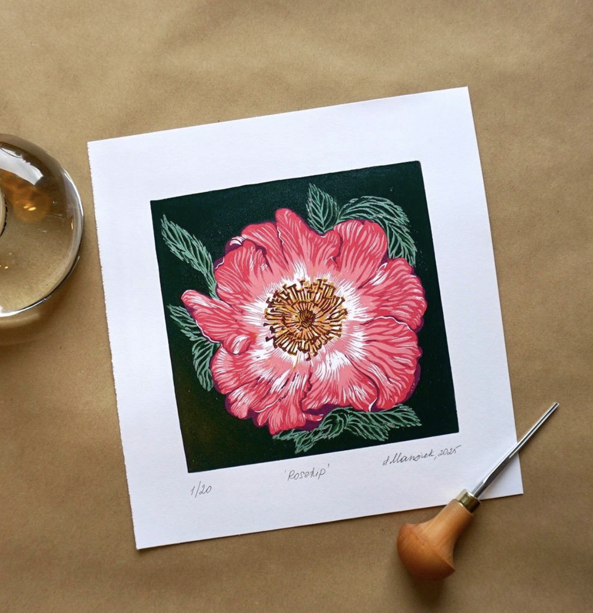 Rosehip, reduction lino print