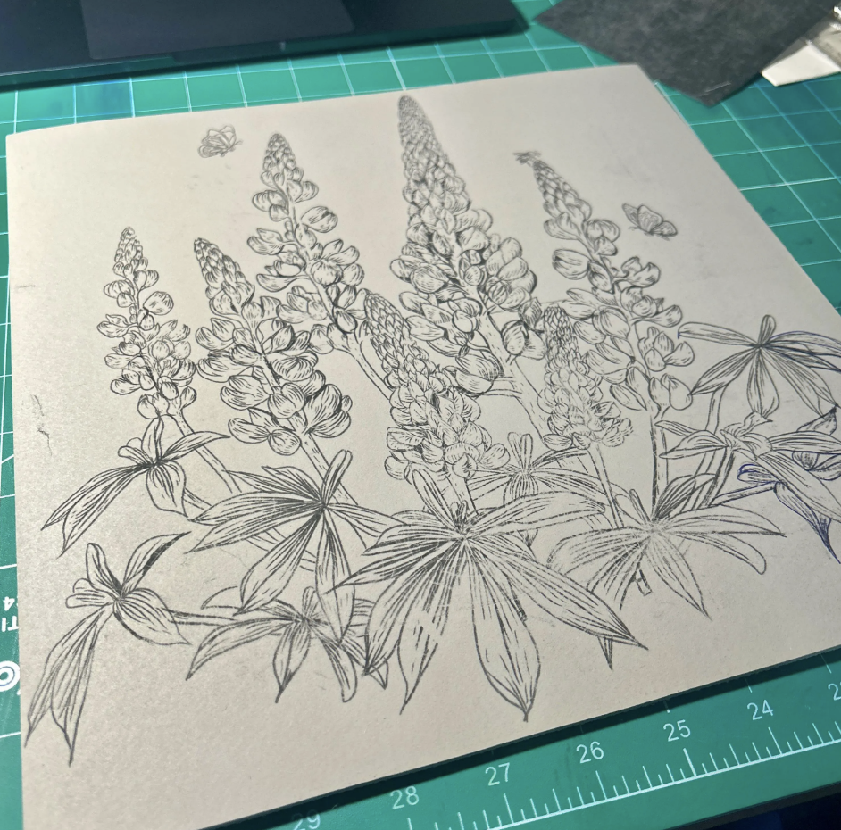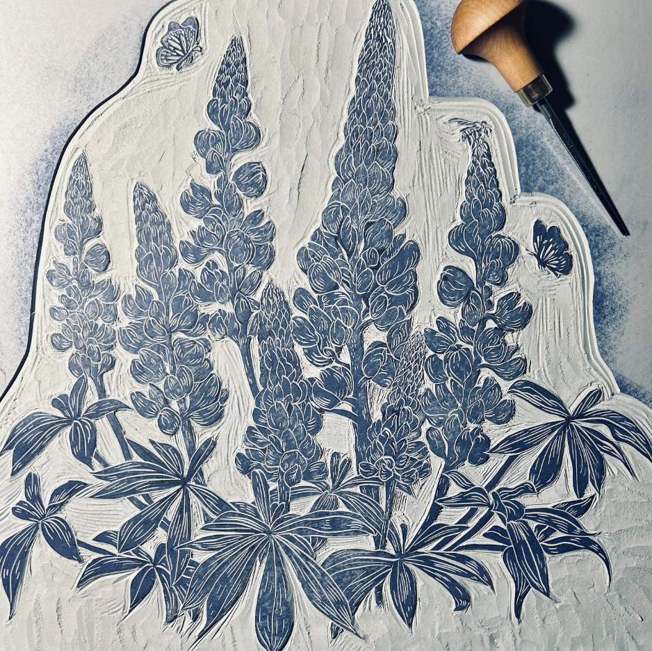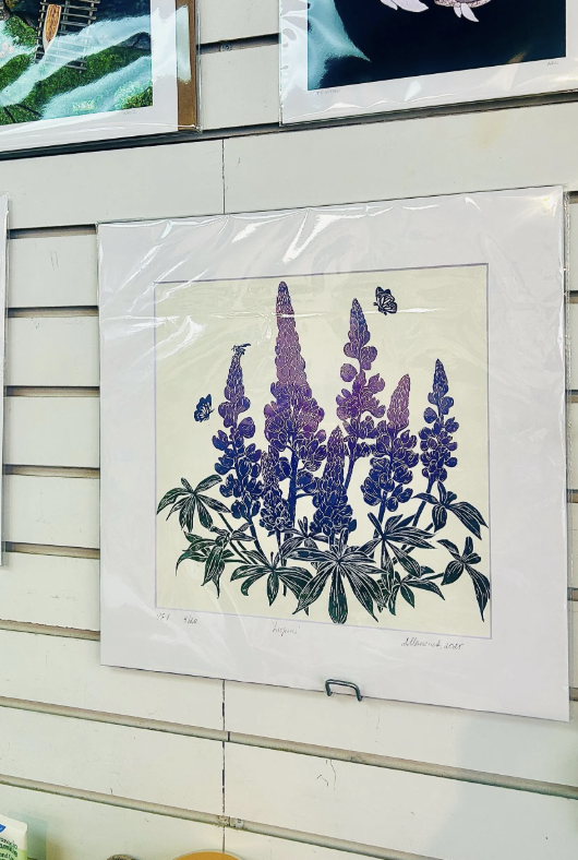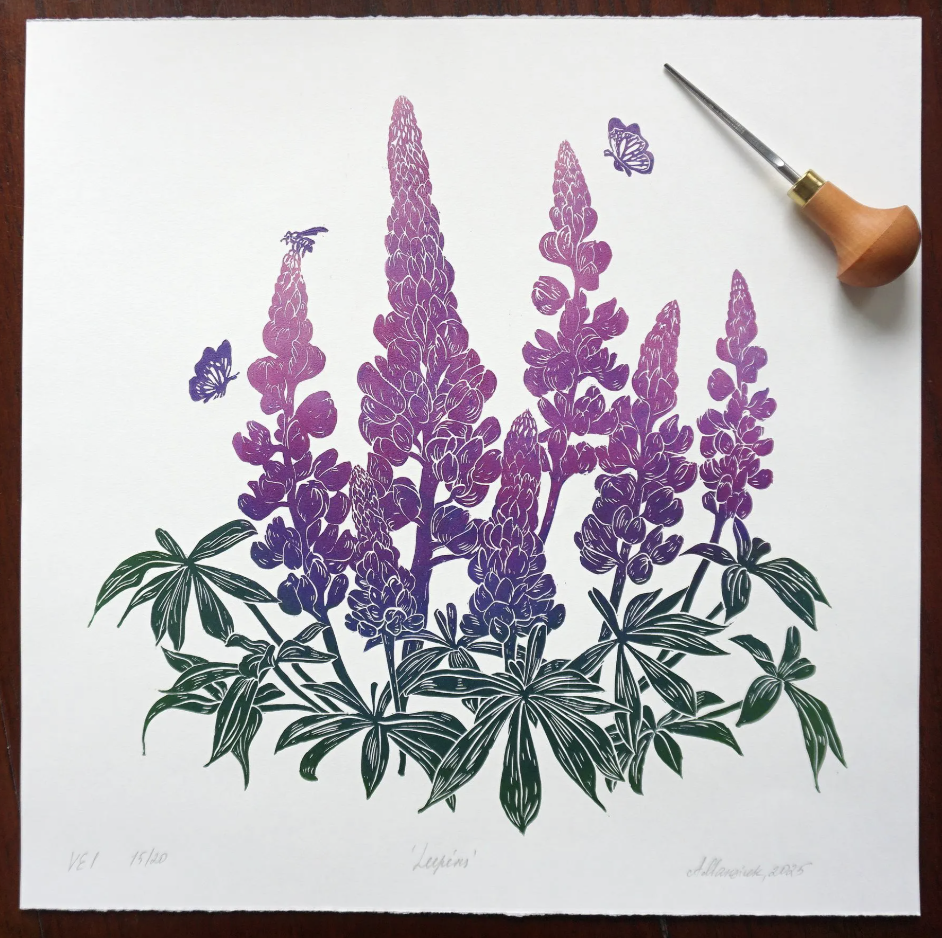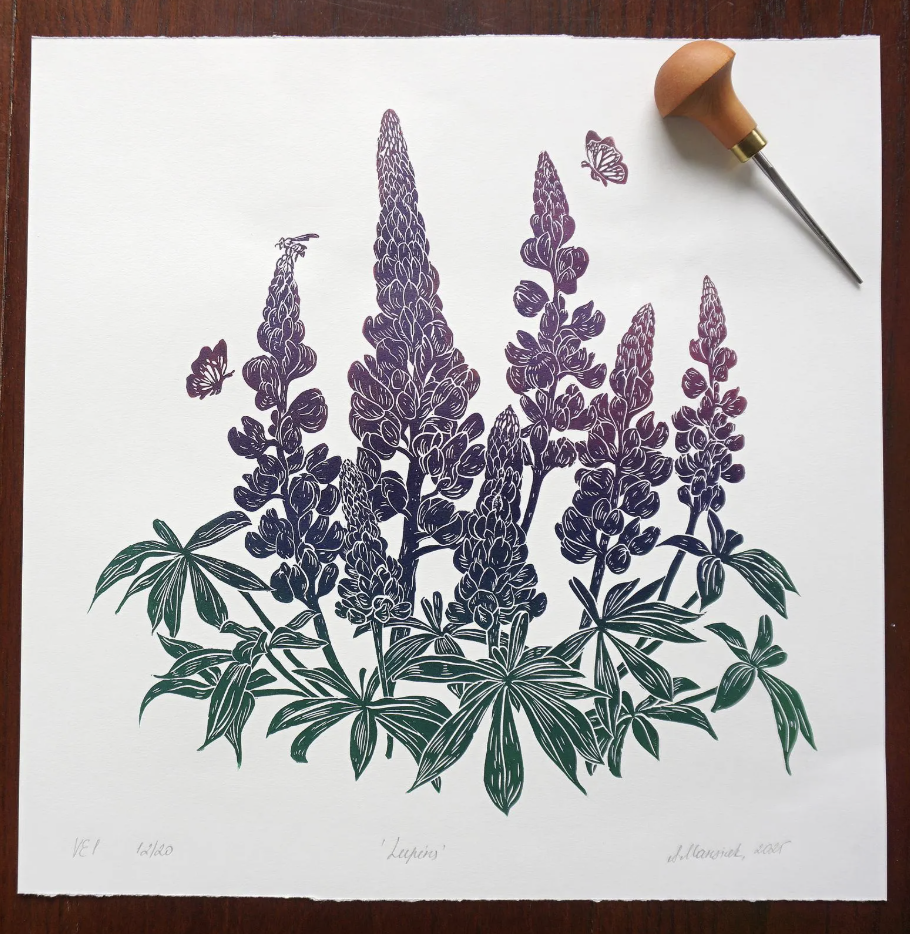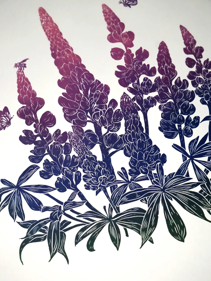 Lupins are ubiquitous in Newfoundland, and their colours vary from soft pink to solid purple. While considered highly invasive species, they still bloom only for a short time, and stay unseen for the rest of the calendar year. Working on this print, I wanted to welcome them to find a place in our homes for a full year-round, because they are so lovely and vibrant! I tried many hues and their combination (some are still drying out), and even if there is some consistency, each print will be slightly different (within one colour).