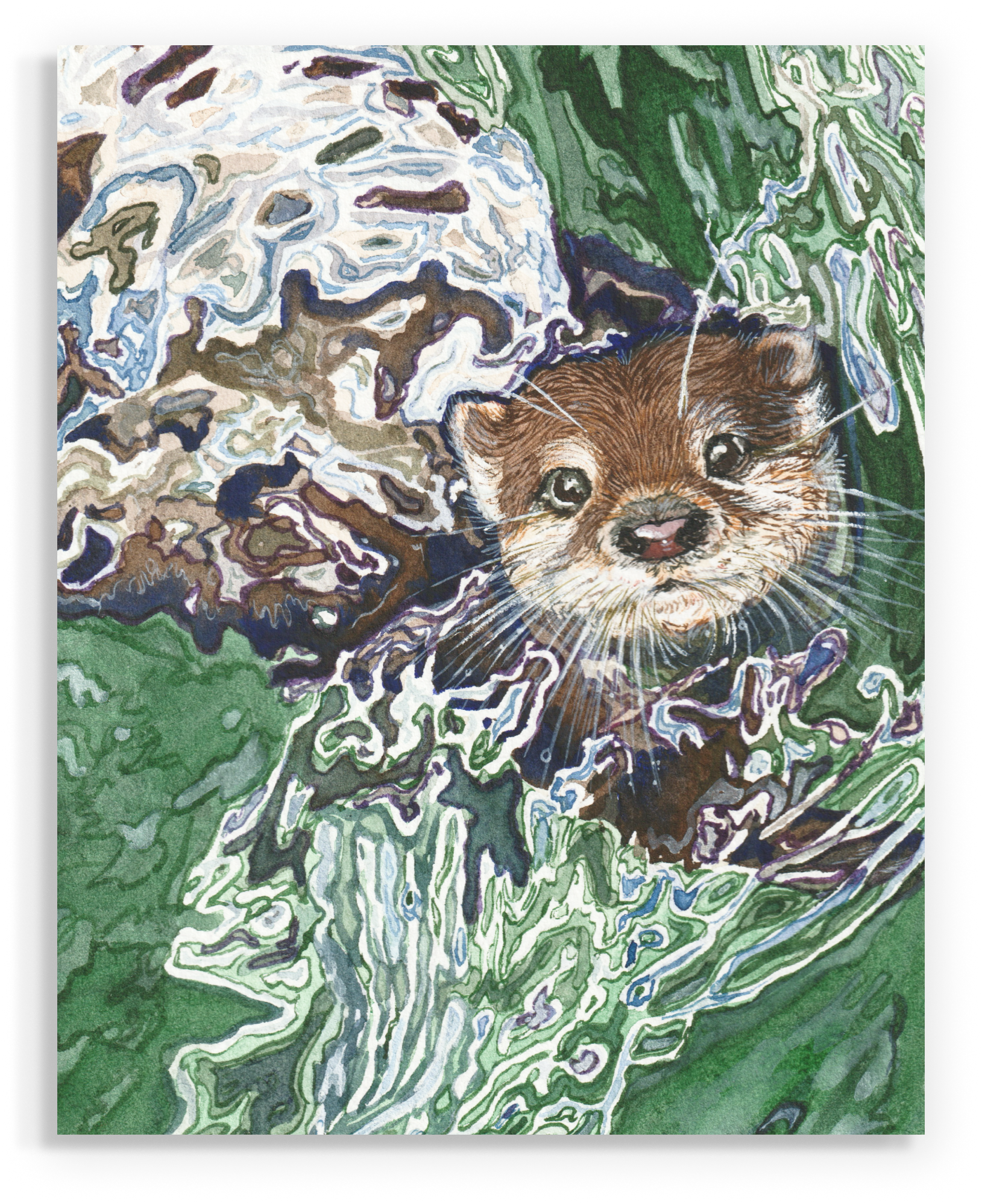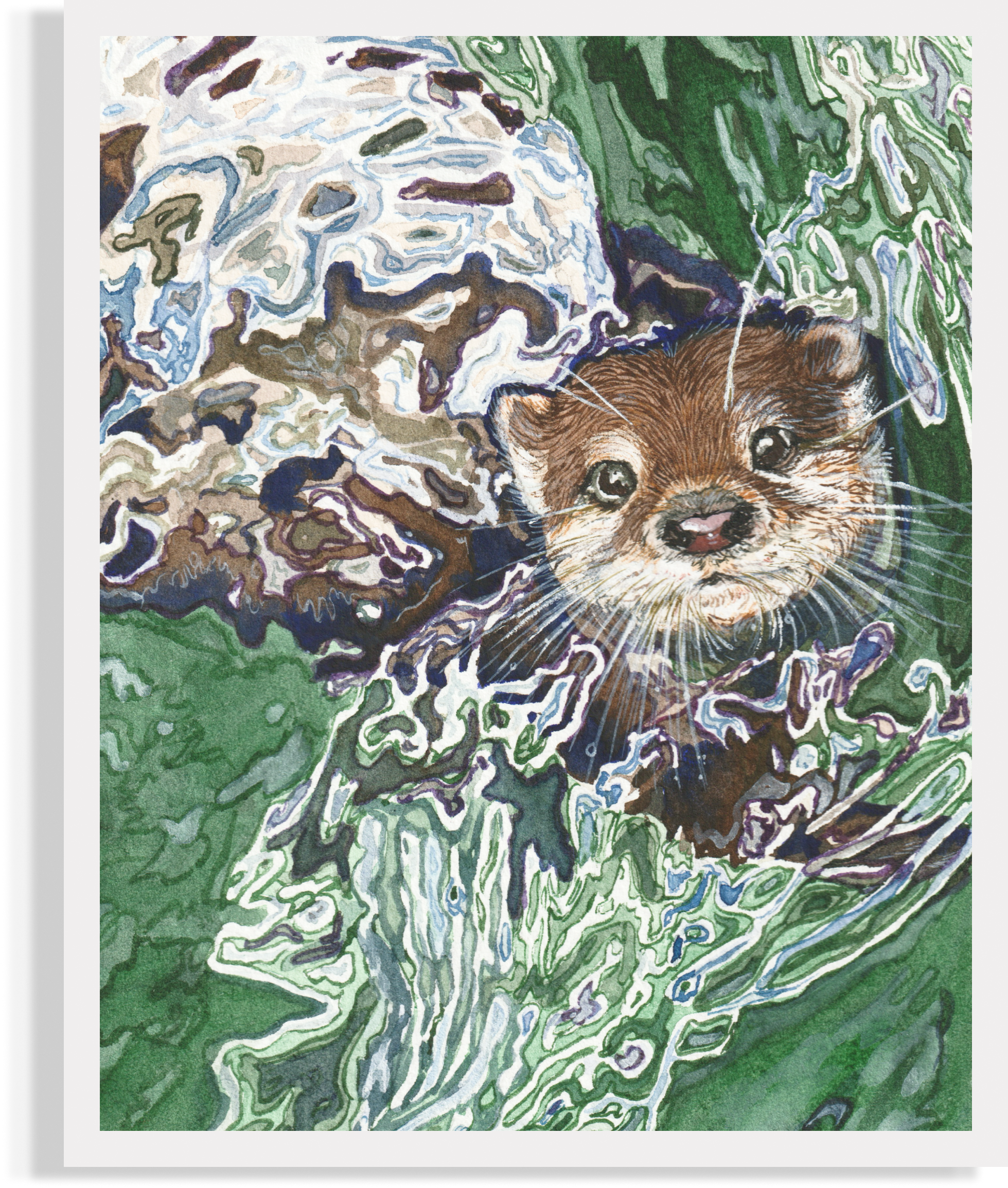 Under the La Manche bridge, I saw a couple of otters that could not share the fish. They were dancing on a large rock beneath the mountain, each sank its teeth into fish, probably chewing at the same time, not to waste a prey in vane. A good hunter, an otter is a cute-looking fellow as well! I tried to capture both personalities – painting its curiosity and attractive appearance at once!