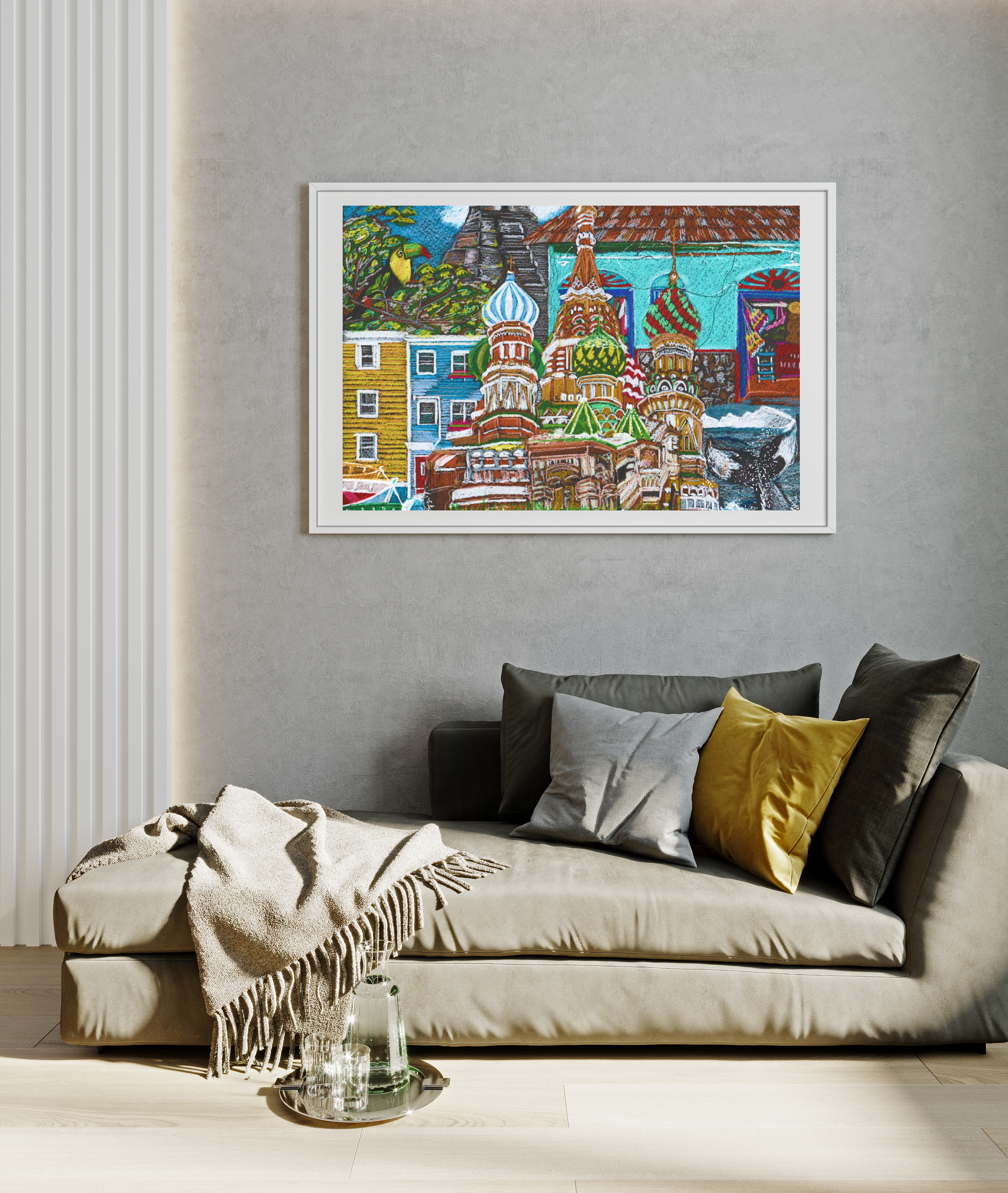 An additional border to facilitate matting/framing is a part of the print. In the pictures, you may see how different image sizes look on a wall.