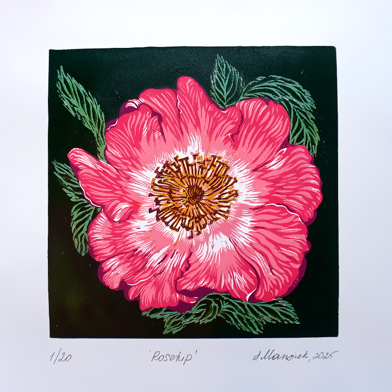 This is a Rosehip reduction lino print. A small edition of 20 prints, 7 colored layers.