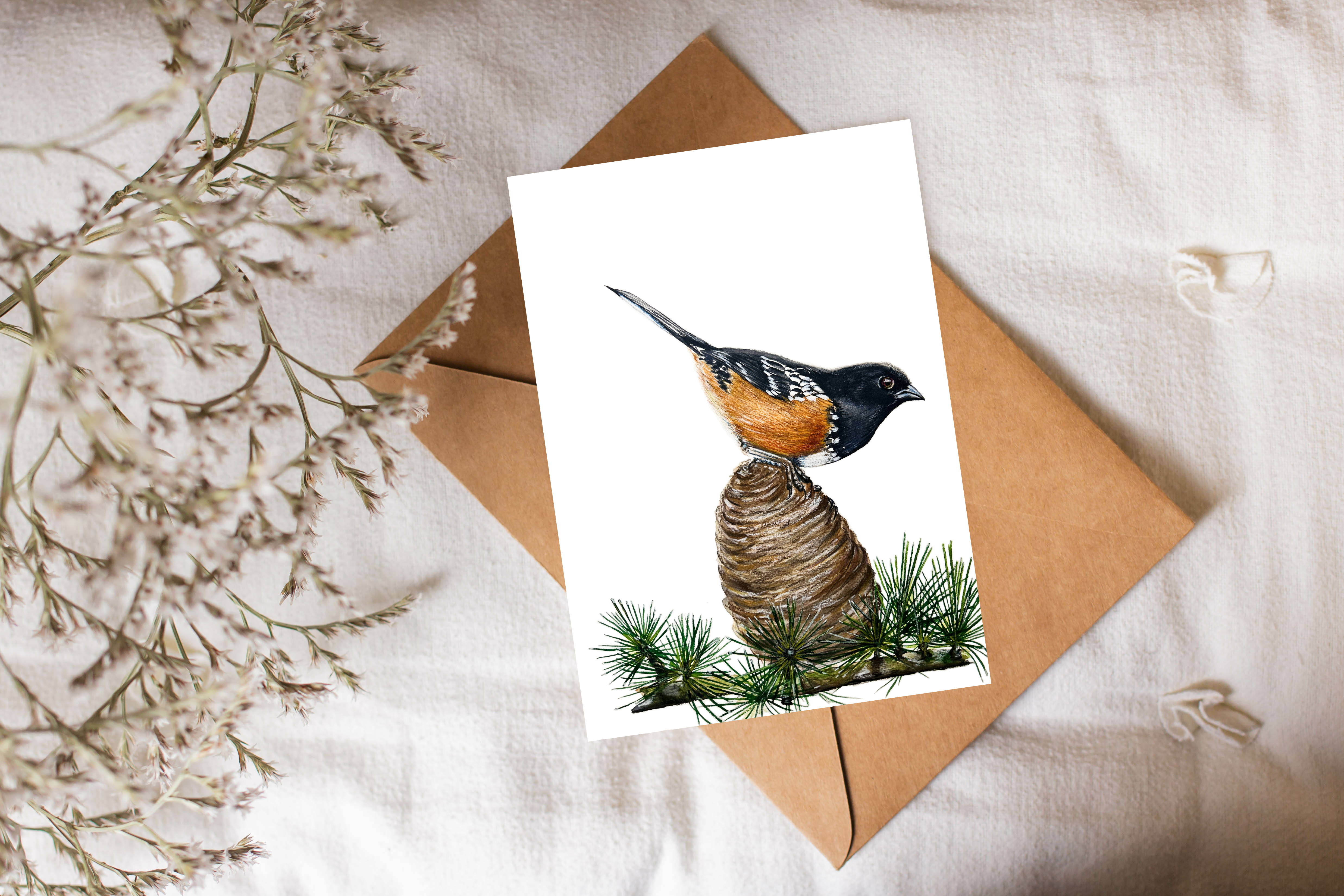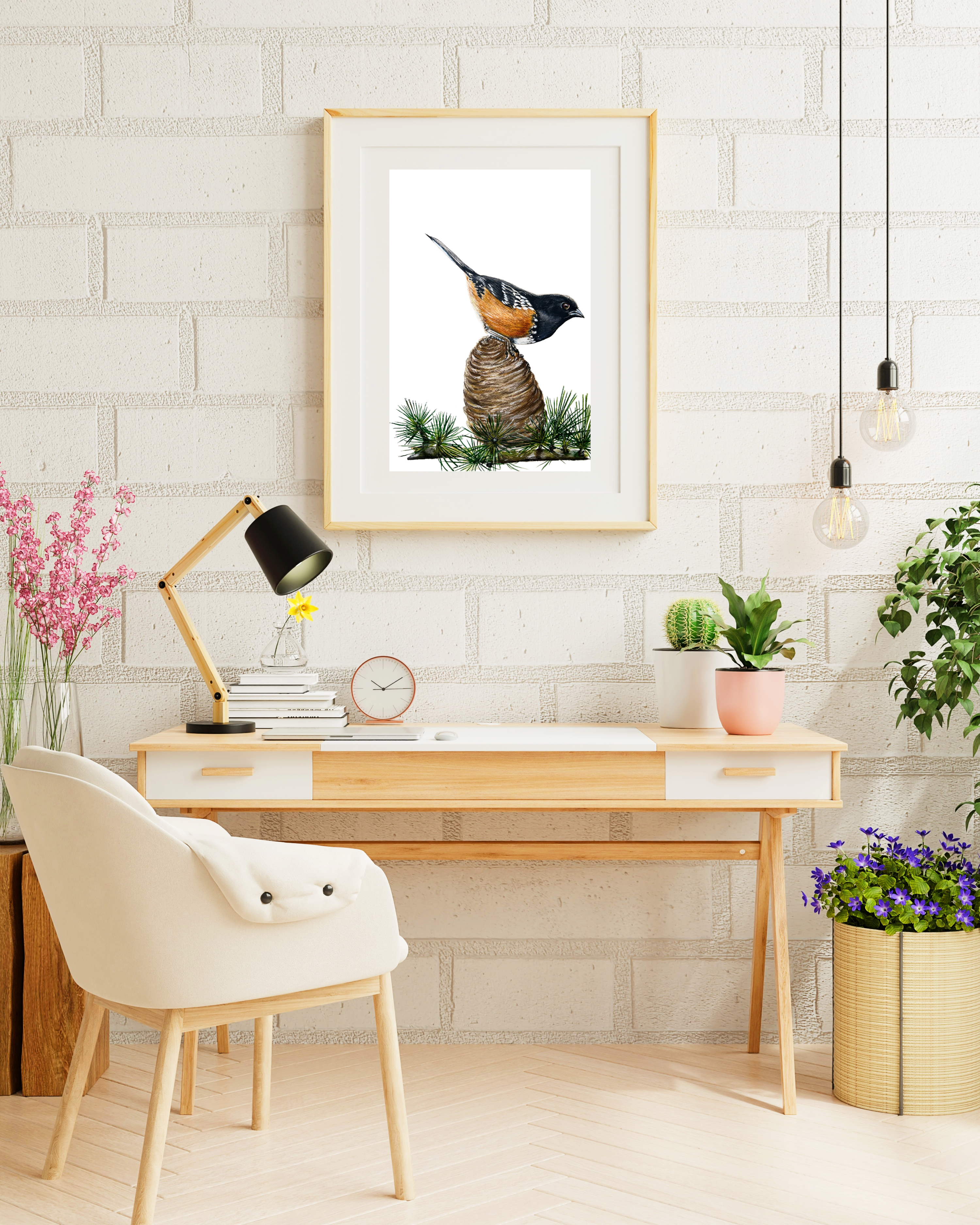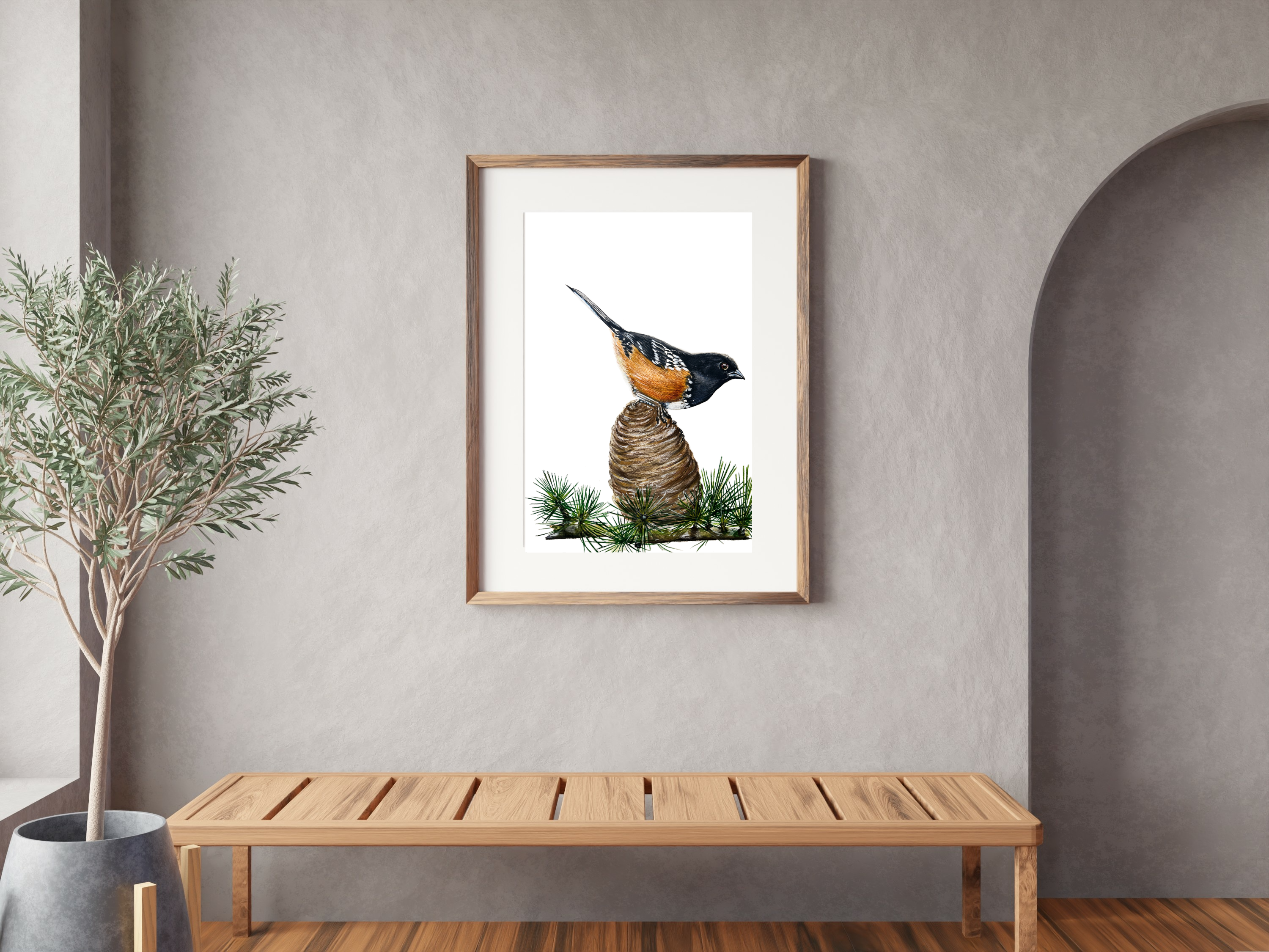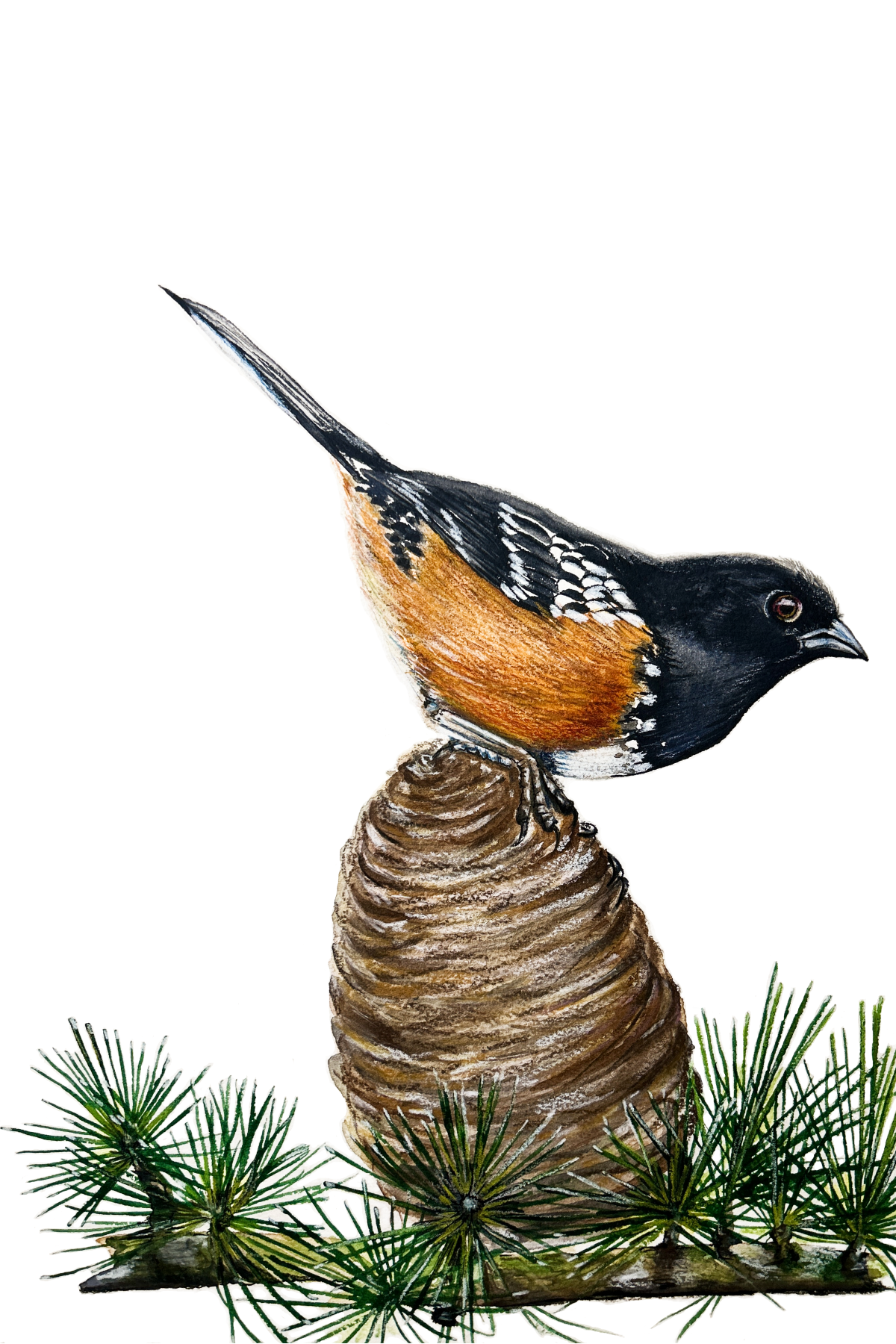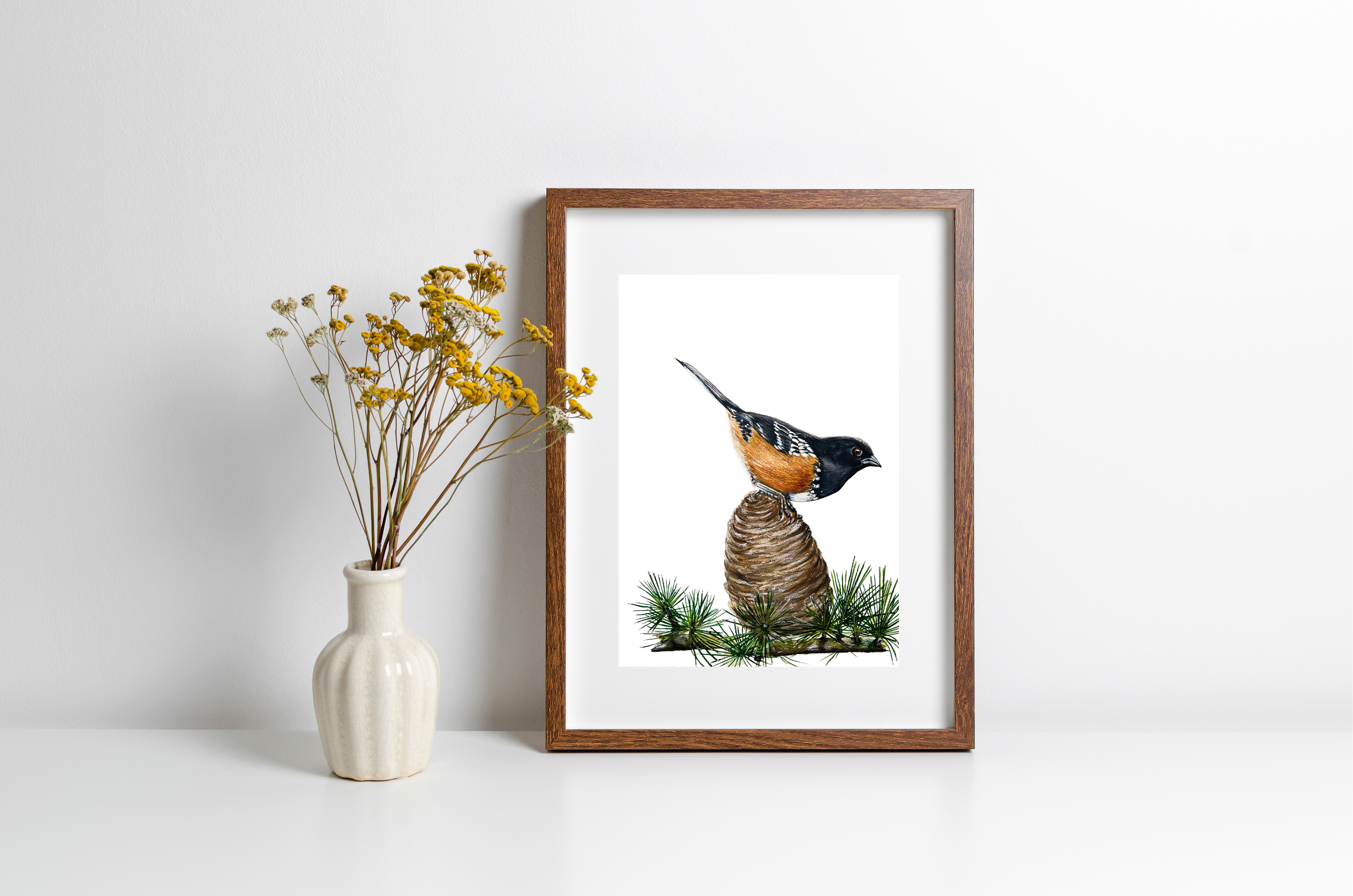 Spotted Towhee is an on-demand print from an original watercolour/coloured pencils painting.