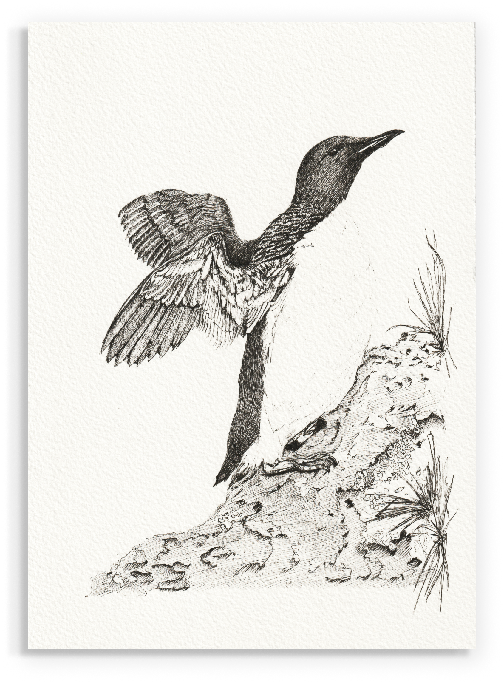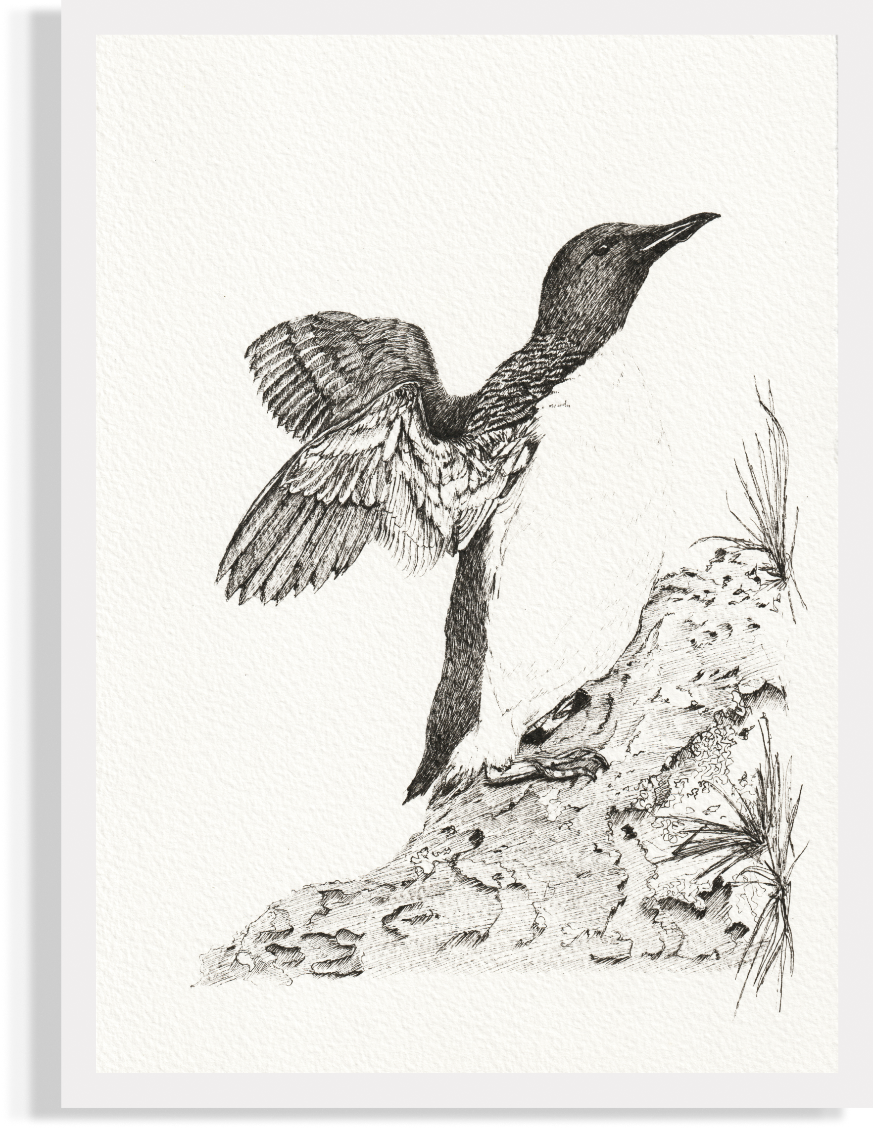 The painting was created only with a black drawing pen. After months of using vivid watercolour, I decided to switch to black and white illustrations and more refinement. As a reminder of the overwhelming reality that often conceals the essence under the bright plumage.